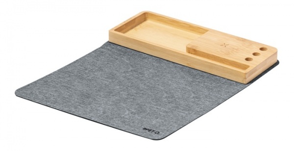 Skladacia polyesterová podložka pod myš RPET so silikónovou základňou. So zabudovanou bezdrôtovou rýchlonabíjačkou (15W) a bambusovým držiakom mobilného telefónu. Polyester 300D RPET. Vrátane USB nabíjacieho kábla.