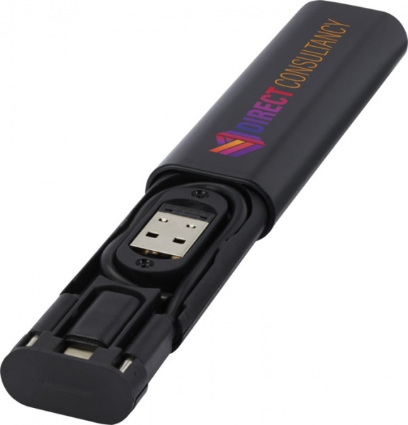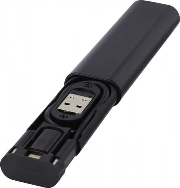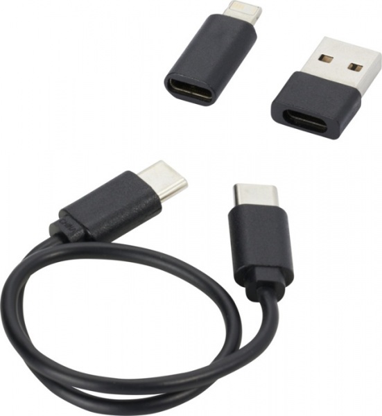 Modulárny kábel na prenos dát a nabíjanie z recyklovaného plastu v boxe. Vstup Typ-C a USB-A a výstup Typ-C/iOS/mikro USB. Box má priestor na karty micro SD a nano SIM karty. Dĺžka: 28 cm. Dodávané v obálke zo 100% recyklovaného kraftového papiera.