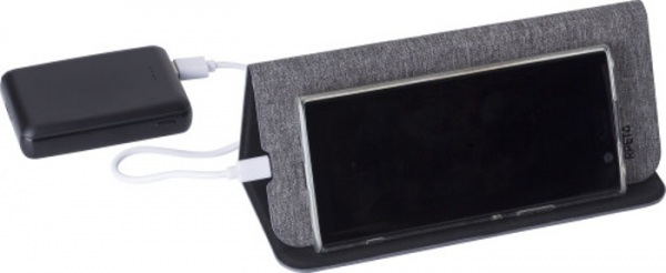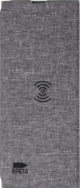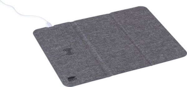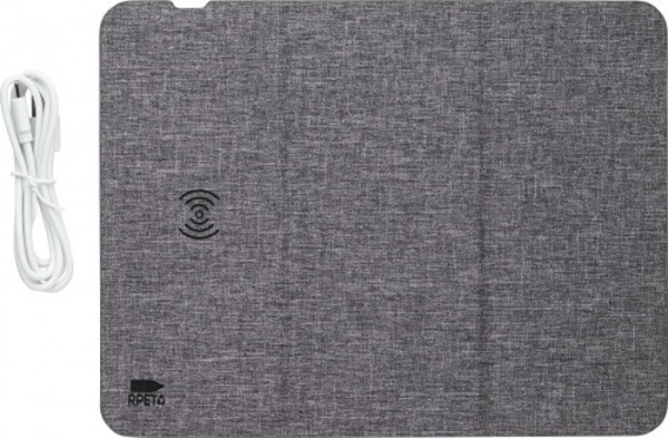 Bezdrôtová rýchlonabíjacia podložka pod myš (10W). Sklopný systém pre použitie ako stojan na telefón. Balené v hnedej kartónovej krabici. S logom RPET.