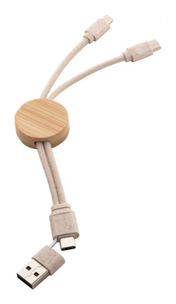 Ekologický USB nabíjací kábel z pšeničnej slamy, bavlny a bambusu s konektormi micro USB, USB-C a Lightning. So vstupmi USB a USB-C.