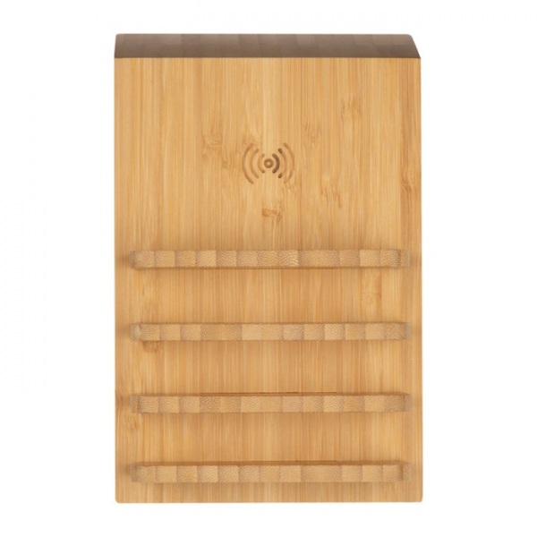 Bambusová nabíjacia stanica pre štyri smartfóny alebo tablety s bezdrôtovou nabíjacou stanicou, dvoma USB portmi, USB-C portom a nabíjacím káblom.