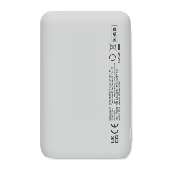 Powerbanka 5000 mAh z recyklovaného ABS. Kapacita pre použitie so smartfónom, Výstup: 1 x Type-C, 2 x Type-A a 1 x Type-B. Vstup: 2 v 1 Type-C a Type-A.