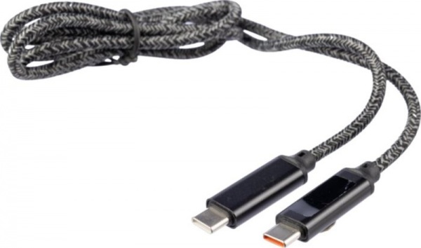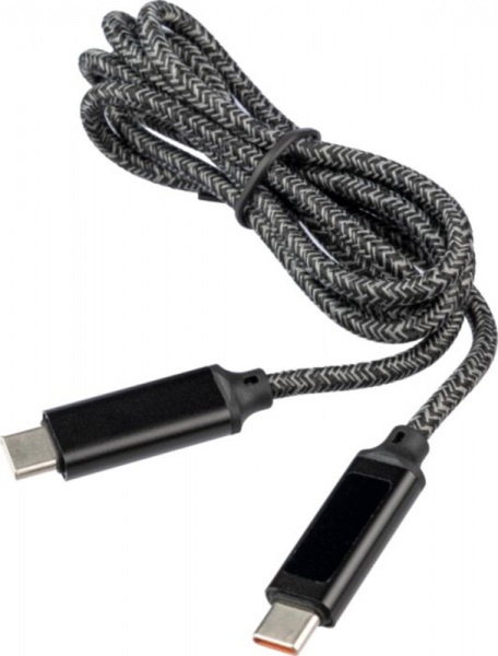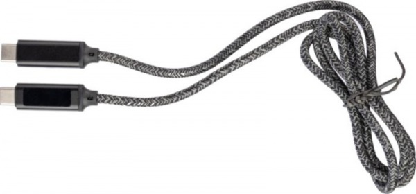 Nylonový látkový nabíjací kábel s hliníkovými konektormi. Dĺžka: 1 meter. USB-C na USB-C. Kapacita: 65 W. Modrá kontrolka rýchlosti nabíjania. Rýchlosť prenosu dát 480 Mbps.