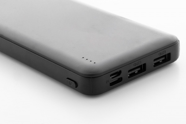 Power banka z recyklovaného ABS plastu s batériou 10 000 mAh. S 2 portami USB a 1 portom USB-C pre nabíjačku. Vstupné porty Micro USB a USB-C. Vrátane USB nabíjacieho kábla.