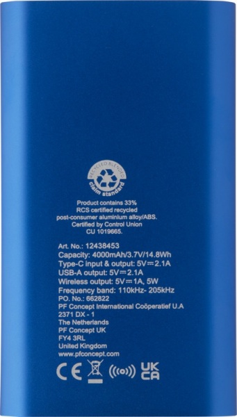 Powerbanka so vstupným/výstupným portom USB-C a portom USB-A, možné nabíjať 2 zariadenia súčasne. Podporuje 5W bezdrôtové nabíjanie pre zariadenia s podporou Qi. 4000mAh batéria s výkonom 10W. Dodávané s nabíjacím káblom TPE typu C na USB typu A.