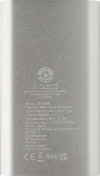 Powerbanka so vstupným/výstupným portom USB-C a portom USB-A, možné nabíjať 2 zariadenia súčasne. Podporuje 5W bezdrôtové nabíjanie pre zariadenia s podporou Qi. 4000mAh batéria s výkonom 10W. Dodávané s nabíjacím káblom TPE typu C na USB typu A.