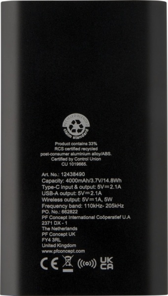 Powerbanka so vstupným/výstupným portom USB-C a portom USB-A, možné nabíjať 2 zariadenia súčasne. Podporuje 5W bezdrôtové nabíjanie pre zariadenia s podporou Qi. 4000mAh batéria s výkonom 10W. Dodávané s nabíjacím káblom TPE typu C na USB typu A.