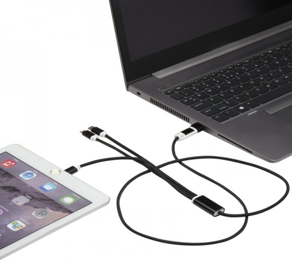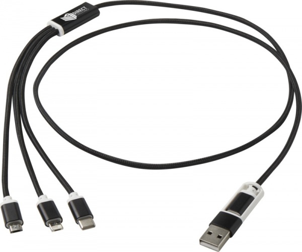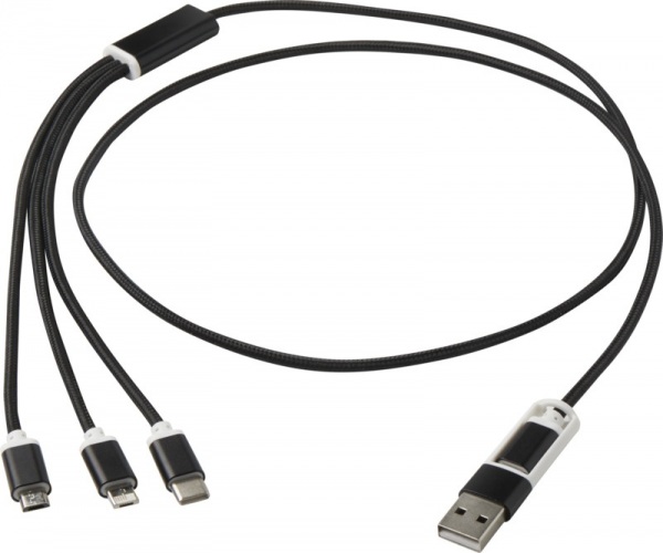 Vstupný konektor USB-A a USB-C spolu s kombinovaným výstupným konektorom USB-C, Micro USB a Lightning/Micro USB. Kábel 100 cm z recyklovaného hliníka a RPET.