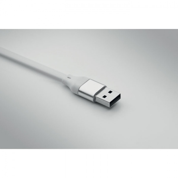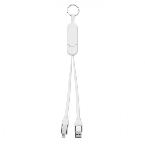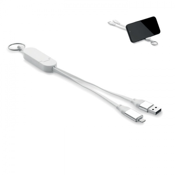 60W kábel v recyklovanom ABS obale s príveskom na kľúče a stojanom na telefón. Vstup: 2 v 1 typu C a typu A. Výstup: Type-C a micro-B (2v1 pin). Dĺžka kábla: 26 cm.