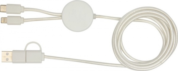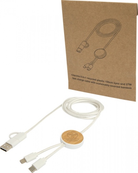 27W dátový synchronizačný kábel 5v1 pre rýchle nabíjanie. Vstupný konektor USB-A a USB-C, výstupný USB-C a Lightning/Micro USB. USB-A na USB-C výstupný výkon max 27W a ostatné pripojenia max 15W. Kompatibilný s CarPlay and Android Auto. Dĺžka: 150 cm.