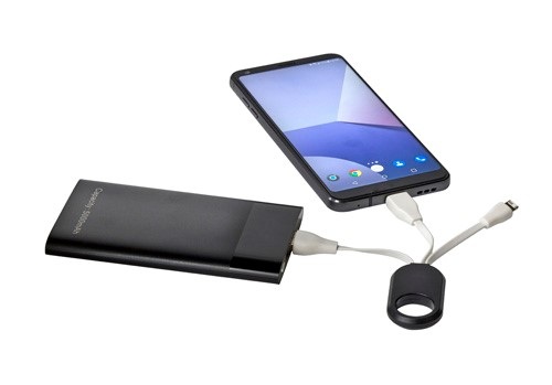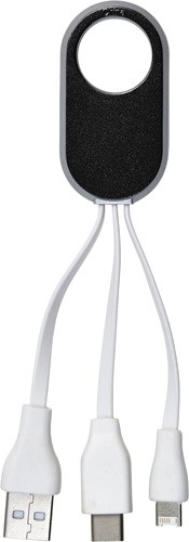 Sada nabíjacieho kábla ABS 3 v 1 s USB-C, bleskom a štandardným USB. Každý kábel je cca. 5,5 cm dlhý a prichytáva sa k držiaku s otvorom (? 1,8 cm).