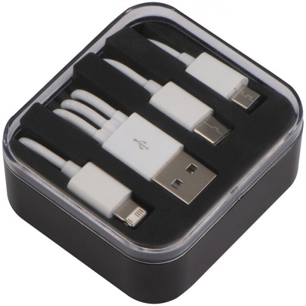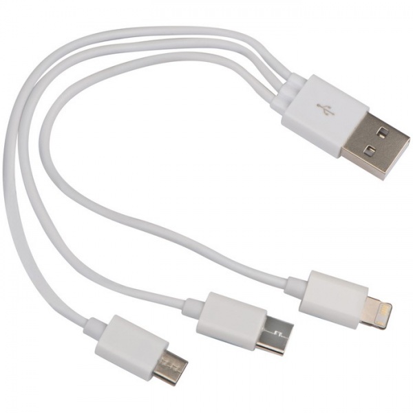 Sada USB káblov, ktorá obsahuje USB, microUSB koncovku a kábel pre nabíjanie zariadení Android a iOS.