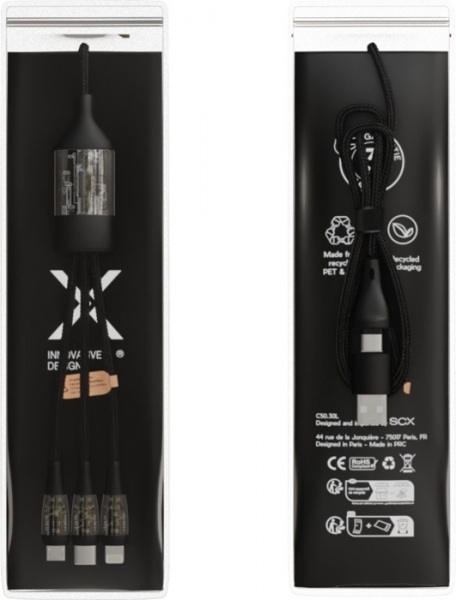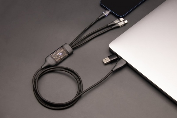 Kábel pre rýchle nabíjanie a prenos dát 5v1. Vstup: USB-A/USB-C. Výstup: Micro USB/Typ-C/Lightning. Rýchle nabíjanie: 100 W/5 A. Priehľadné konektory. Digitálny displej s prenosovou rýchlosťou vpredu a podsvieteným logom vzadu.