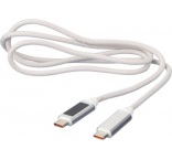 Nylonový látkový nabíjací kábel s hliníkovými konektormi. Dĺžka: 1 meter. USB-C na USB-C. Kapacita: 65 W. Modrá kontrolka rýchlosti nabíjania. Rýchlosť prenosu dát 480 Mbps.