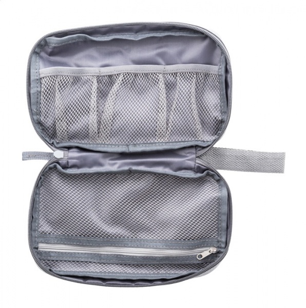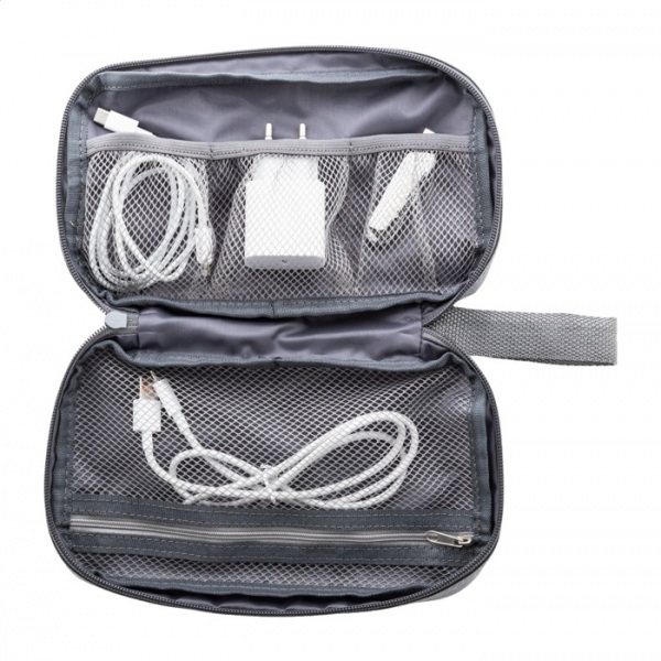 Puzdro na organizér káblov RPET na zips s vnútornými priehradkami zo sieťoviny a predným vreckom na zips. 900D RPET polyester s výrazným štítkom RPET.