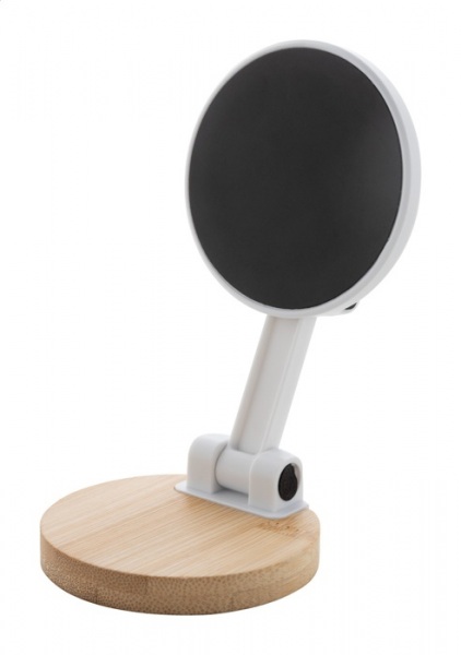 Magnetický stolný držiak mobilného telefónu z bambusu a recyklovaného ABS. Vrátane samolepiaceho kovového krúžku na použitie magnetickej funkcie na akomkoľvek zariadení. Kompatibilný s iPhone® 12 alebo novším.
