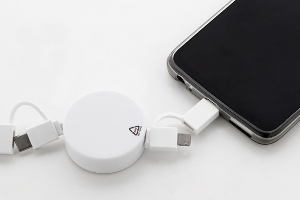 Teleskopický nabíjací kábel USB z recyklovaného ABS s konektormi micro USB, USB-C a Lightning. So vstupmi USB a USB-C.