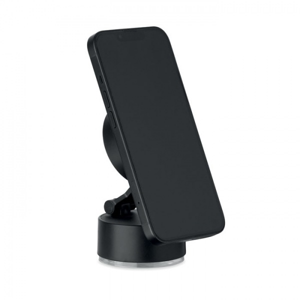 Magnetický držiak na telefón z ABS materiálu. Vákuové uchytenie s prísavkou. Kompatibilný s iPhone® 12 a novšími modelmi. Vrátane dodatočného magnetického kovového krúžku na podporu nabíjania iných nemagnetických bezdrôtovo nabíjateľných telefónov.