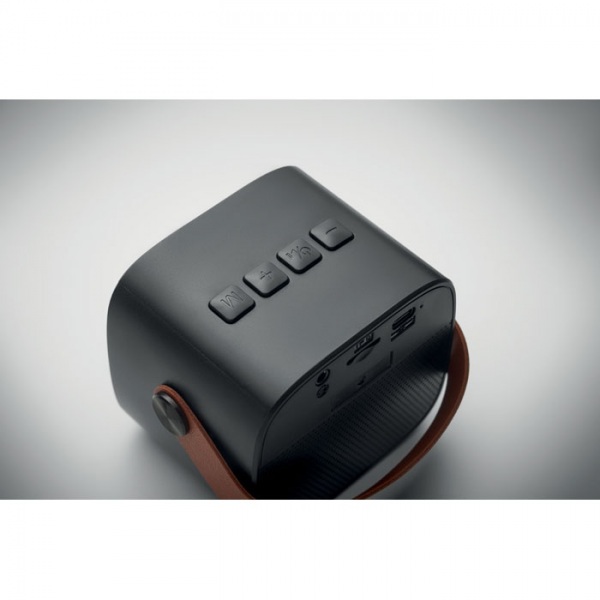 Bezdrôtový 5.0 reproduktor z recyklovaného ABS plastu s PU rukoväťou. Súčasťou balenia je 1 nabíjateľná Li-ION batéria s kapacitou 500 mAh. Vrátane portu pre SD kartu a kábla AUX/USB. Výstupné údaje: 5 W, 3 Ohmy a 5 V. Doba prehrávania približne 4 hodiny.