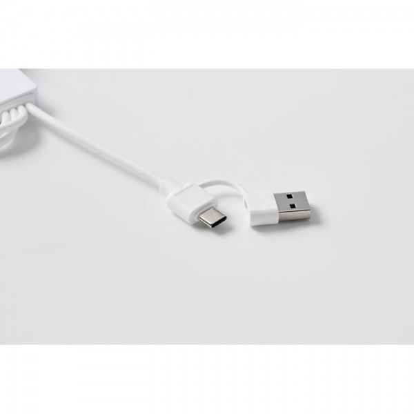 Kľúčenka s nabíjacím káblom so vstupom: 2 v 1 typ-C a typ-A. Výstup: Nabíjanie hodiniek (Samsung® a Apple®), 2 x typ-C a micro-B (2 v 1 pin). Kábel vyrobený z recyklovaného TPE.
