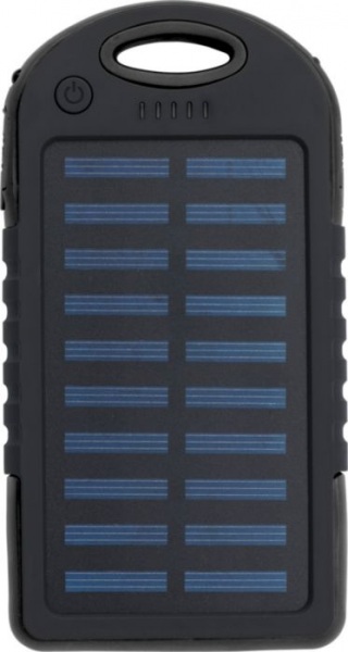 Pogumovaná solárna powerbanka z ABS plastu so zelenými kontrolkami a bočnou baterkou. Dva USB porty a jeden USB-C port. Solárne nabíjanie 5V/200mA. Vstup DC 5V/1A. Výstup DC 5V/2x1A. Kapacita: 4 000 mAh. Súčasťou balenia je USB kábel.