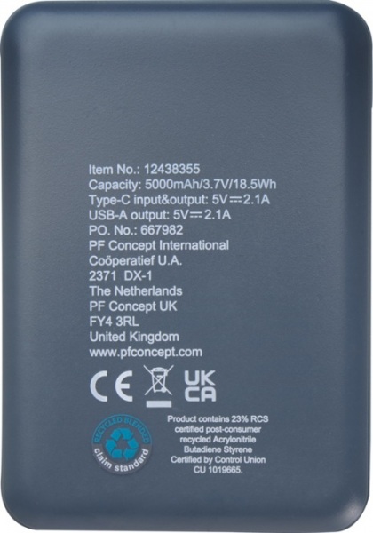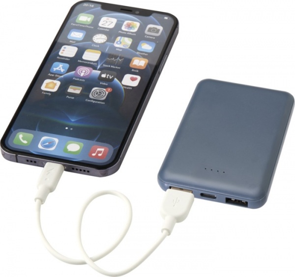 Powerbanka s tenkým a elegantným dizajnom, vstupným/výstupným portom typu C a dvoma portami USB typu A, čo znamená, že je možné nabíjať 3 zariadenia súčasne. 5000mAh batéria s výkonom 10 W. Dodávané s nabíjacím káblom TPE typu C na USB typu A.