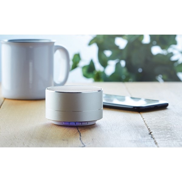 Hliníkový 4. 2 Bluetooth reproduktor s nabíjacou 450mAh batériou a svetlom na spodnej strane. Doba hrania cca 3 hod.