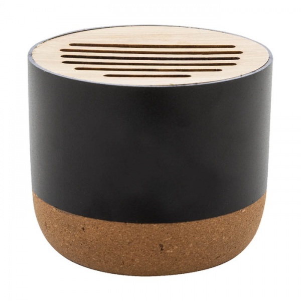 Bezdrôtový reproduktor v puzdre z recyklovaného hliníka s bambusovou sieťovinou a základňou z prírodného korku. S dobíjacou batériou (400 mAh). Vrátane nabíjacieho kábla USB.