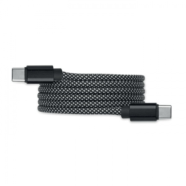 Pletený magnetický kábel odolný voči zamotaniu vyrobený z hliníka a RPET s certifikátom GRS. Typ C do C, rýchle nabíjanie 60 W, dĺžka 1 m. Vždy sa úhľadne stohuje a nikdy sa nezaviaže do uzla.