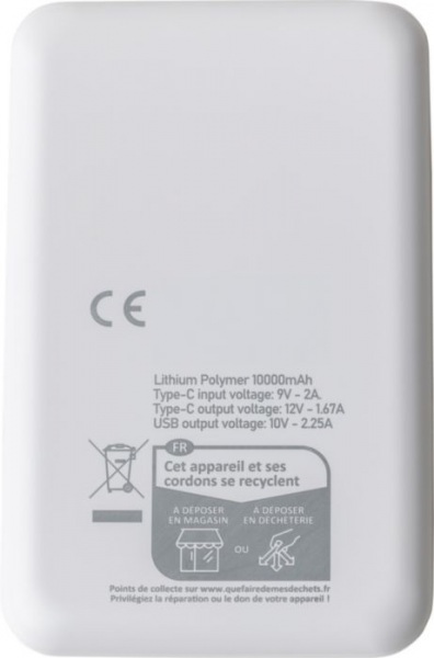 Powerbanka z recyklovaného ABS plastu (10 000 mAh). Rýchle nabíjanie 22,5 W. Vstup/výstup typu C, vstup typu A. Digitálny displej, hladký/textúrovaný dizajn. Bezpečnostné prvky. Balené v hnedej krabici s hodvábnym papierom.