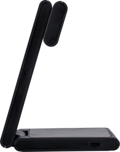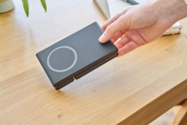 Magnetická nabíjačka 3 v 1 z recyklovaného ABS plastu pre telefón (15 W), AirPods (5 W) a iWatch (2 W). Ultra plochá so skladacím stojanom. Vstup: 5 V/3 A alebo 9 V/3 A. Balené v hnedej krabici.