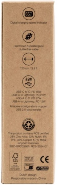 Kábel BrandCharger Thor Eco 4 v 1 ponúka rýchle nabíjanie až do 65W a podporuje prenos dát cez USB 2.0. Kábel s dĺžkou 120 cm je vyrobený z recyklovaného nylonu a obsahuje vstupy typu C a USB-A s výstupmi typu C a Lightning.