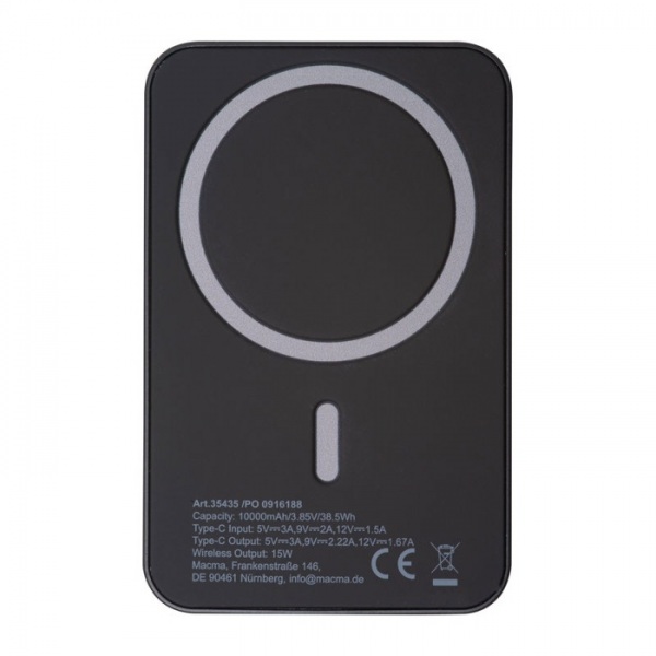 Powerbank Magsafe® z recyklovaného ABS s kapacitou 10 000 mAh a funkciou super rýchleho nabíjania 15W, obsahuje USB-C kábel. Vstavaný magnet umožňuje priamu montáž na iPhone®. Pre iné zariadenia Qi funguje ako bezdrôtová nabíjačka