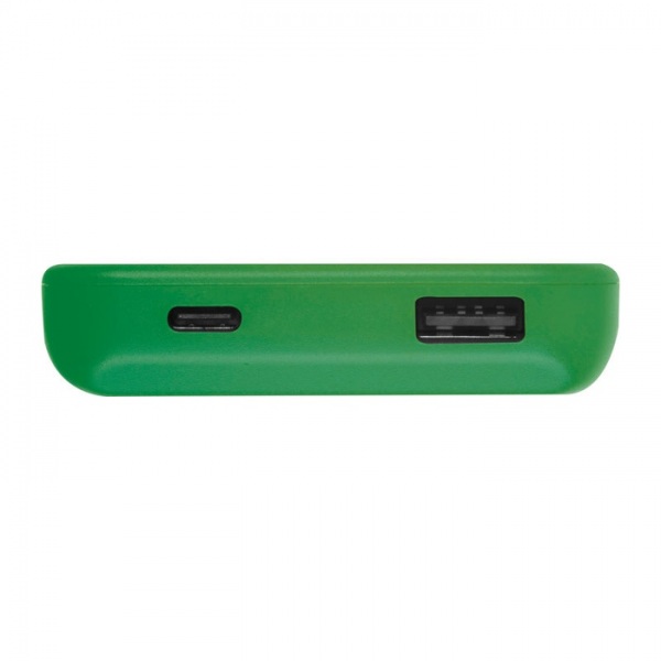 Powerbank (10 000 mAh) z recyklovaného plastu (RABS) s dvoma portami: USB-C in/out 5V/2,1A a USB-A out 5V/2,1A. Obsahuje 50 cm nabíjací kábel.