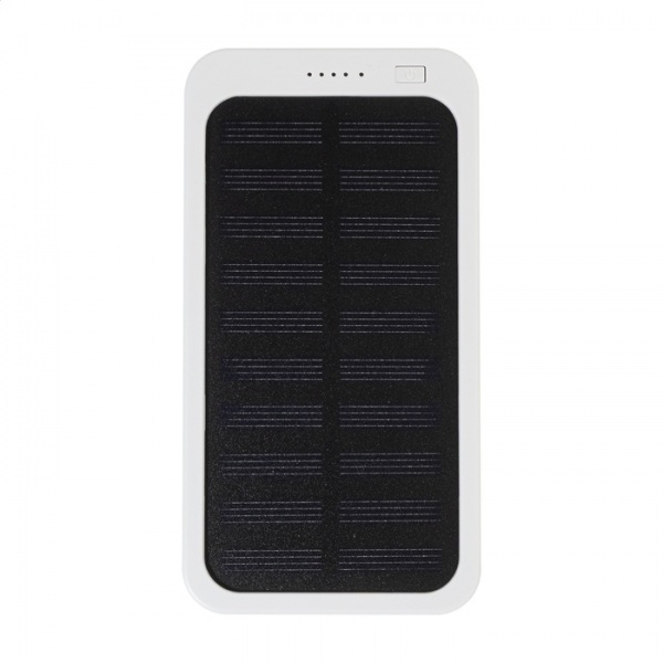 Power banka z recyklovaného ABS plastu so vstavanou solárnou nabíjačkou a batériou 4000 mAh. S 1 USB a 1 USB-C portom na nabíjanie. Vstupný port USB-C. Vrátane nabíjacieho kábla USB.