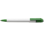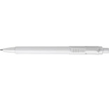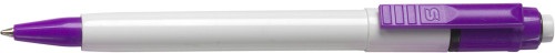Plastové guľôčkové pero s bielym telom a farebným klipom. Pero má modrý atrament.