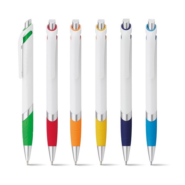Guľôčkové pero s farebnou protišmykovou rukoväťou a sponou. Modrá náplň.