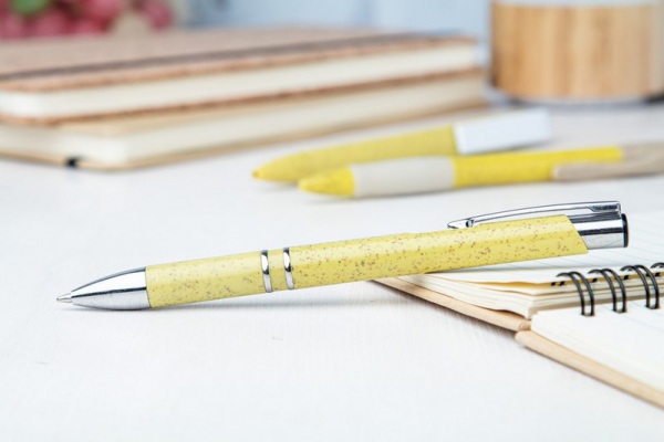 Guľôčkové plastové pero z ekologických častí z pšeničných stebiel, s modrou náplňou.