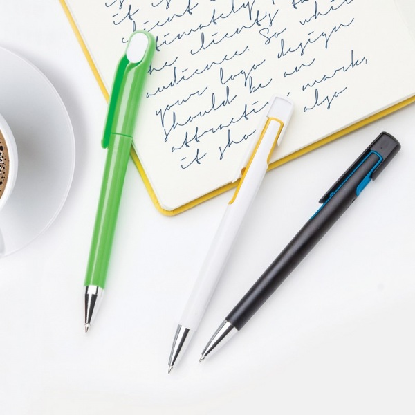 Plastové pero s farebnými doplnkami a chrómovou špičkou. Dodávané s modrou náplňou.