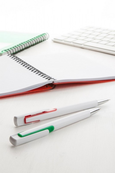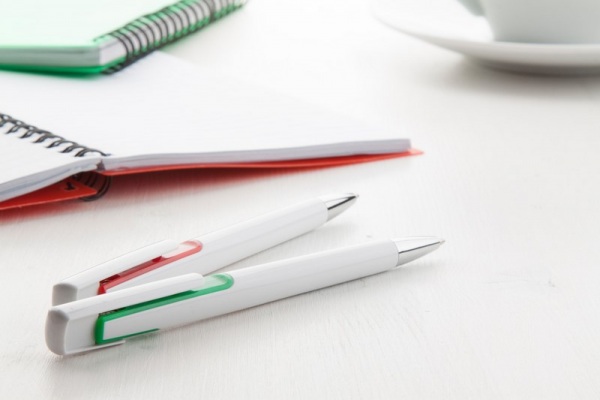 Plastové pero s farebnými doplnkami a chrómovou špičkou. Dodávané s modrou náplňou.
