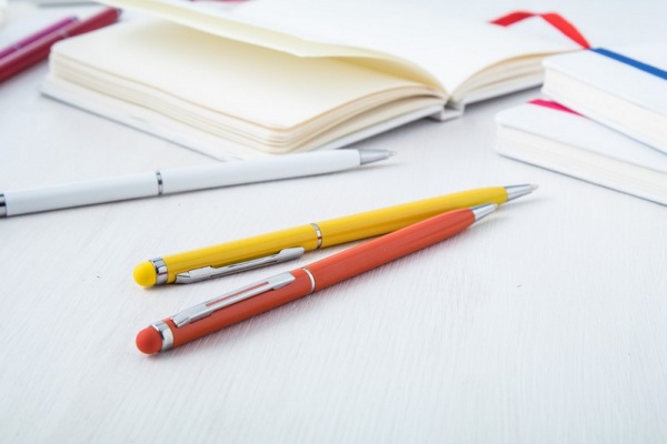 Hliníkové guľôčkové a dotykové pero s modrou náplňou.