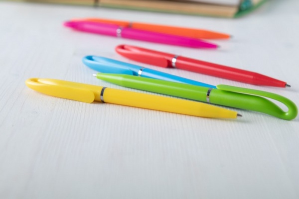 Plastové guličkové pero s modrou náplňou.