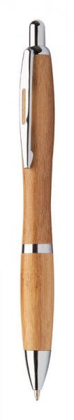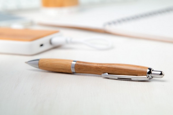 Bambusové guličkové pero s kovovým klipom a modrou náplňou.