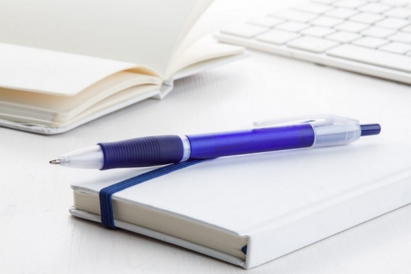 Plastové pero s pogumovaným gripom as modrou náplňou.