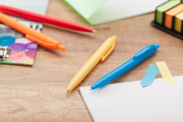 Klasické plastové guľôčkové pero s modrou náplňou.