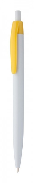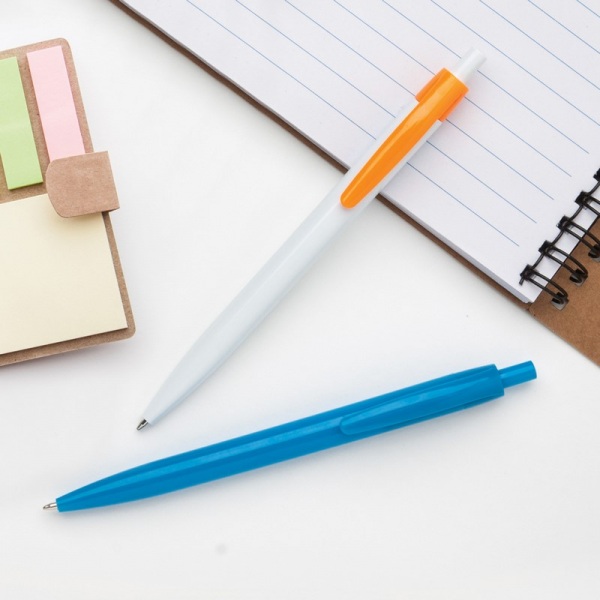 Plastové pero s bielym telom a farebným klipom, s modrou náplňou.