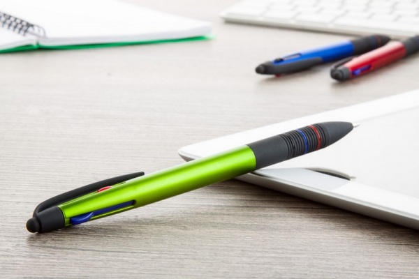 Plastové guľôčkové a dotykové pero s pogumovaným úchopom a telom s matnou metalickou úpravou. Tri farebné náplne: modrá, čierna a červená.