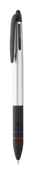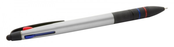 Plastové guľôčkové a dotykové pero s pogumovaným úchopom a telom s matnou metalickou úpravou. Tri farebné náplne: modrá, čierna a červená.