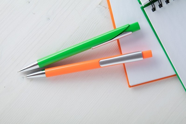 Plastové pero so strieborným klipom a chrómovou špičkou, s modrou náplňou.