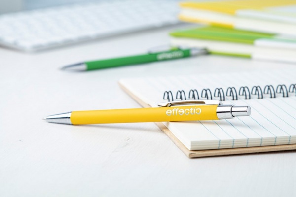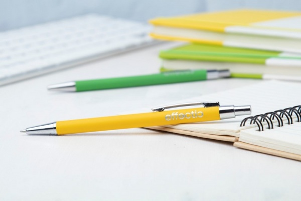Hliníkové guličkové pero s pogumovanou úpravou a modrou náplňou. Špeciálny povrch pre zrkadlový laser.